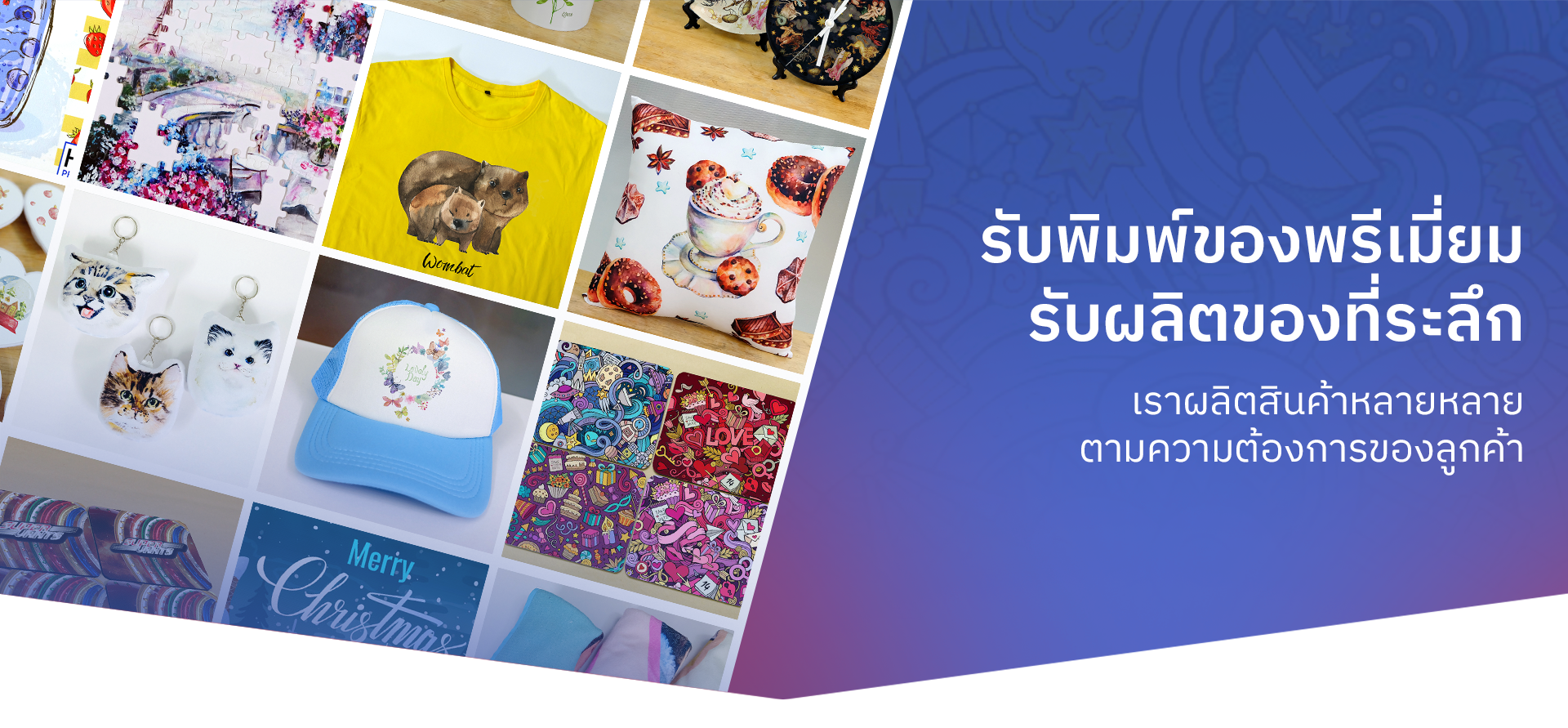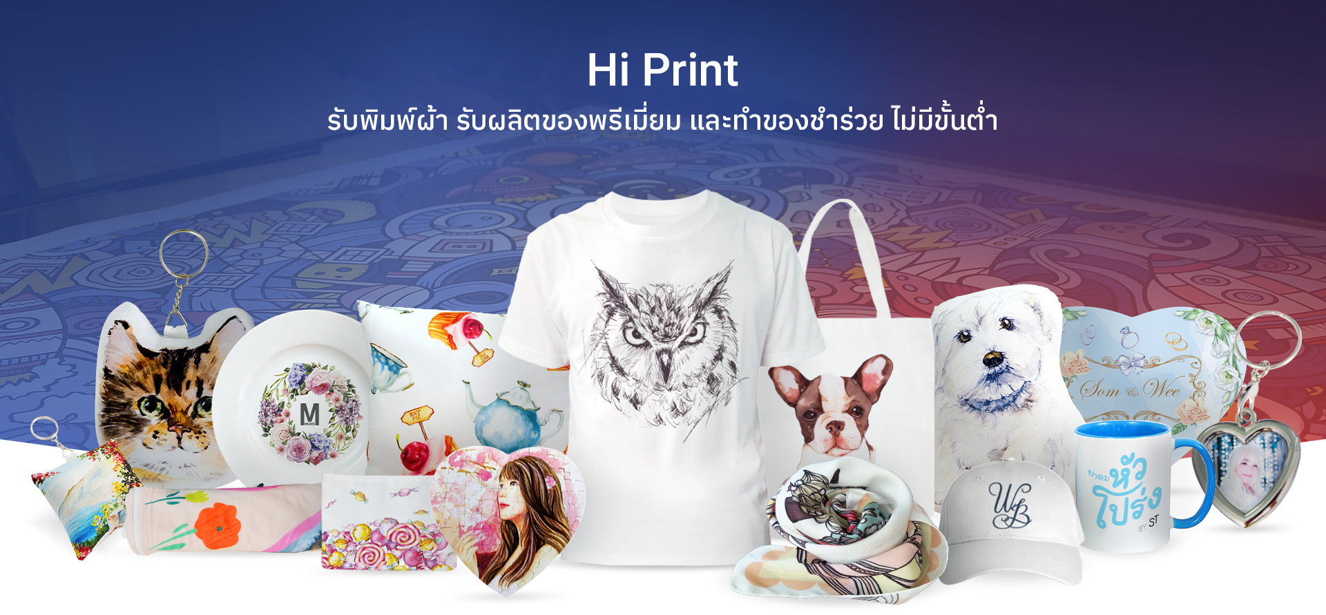 เรามีสินค้าและบริการที่หลากหลาย ไม่ว่าจะเป็นพิมพ์ผ้า ยกม้วน พิมพ์เสื้อ หมอน กระเป๋า ผ้าพันคอ แก้ว จาน หมวก พวงกุญแจ นาฬิกา จิ๊กซอว์ เป็นต้น